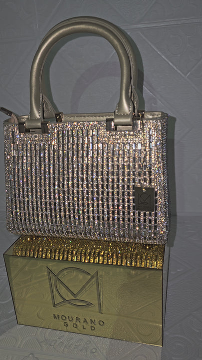 Πολυτελής τσάντα χειρός σε χρυσή απόχρωση, διακοσμημένη με πυκνές σειρές από αστραφτερά στρας. Διαθέτει σταθερές λαβές, κομψό κλείσιμο με φερμουάρ και άνετο εσωτερικό. Ένα λαμπερό statement αξεσουάρ που απογειώνει κάθε επίσημη και βραδινή σας έξοδο.